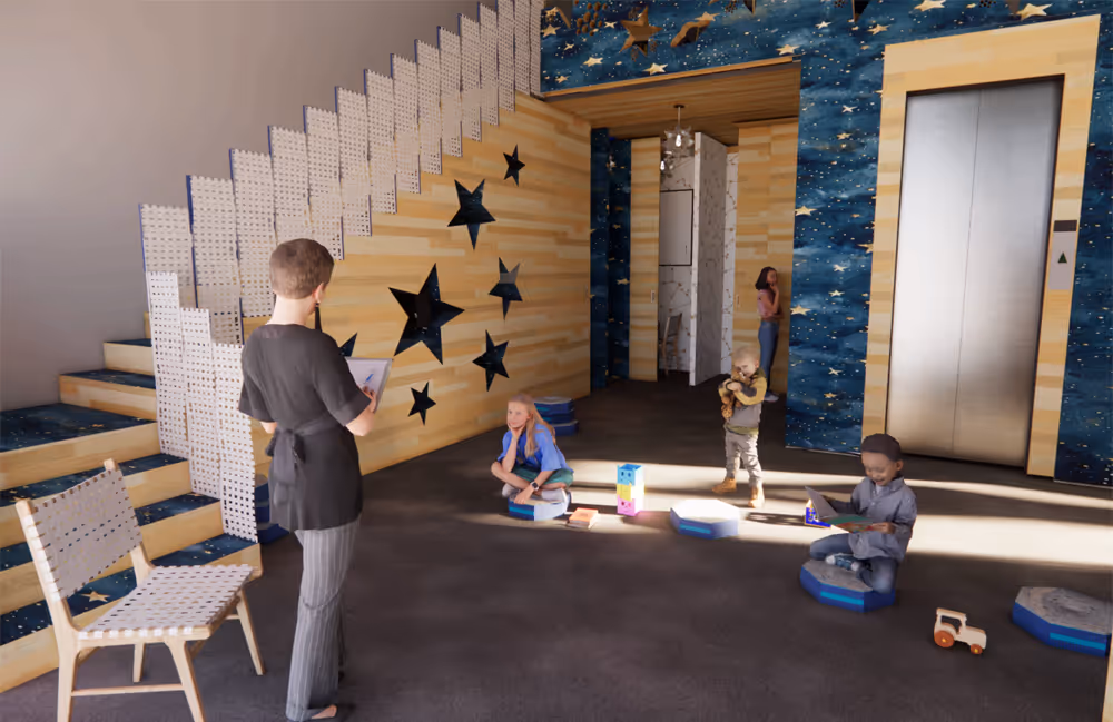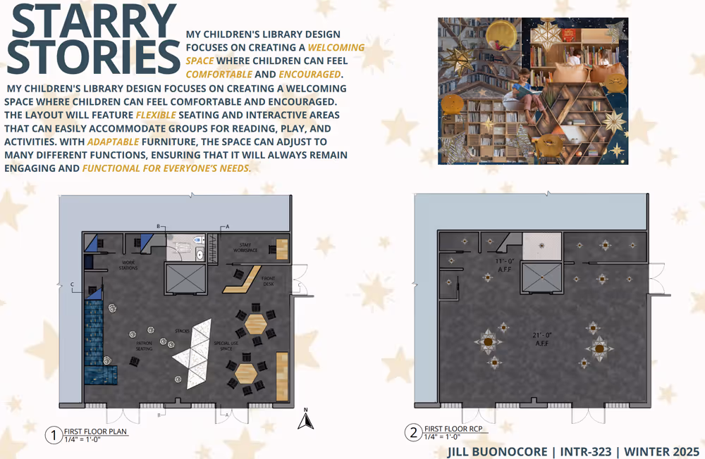 For INTR-323: Interior Studio II, the midterm focused on a material study, where I experimented with wooden coffee stirrers and straw wrappers to construct a three-dimensional triangular model. This got me to explore how simple, everyday materials could be transformed into structural and design elements. When developing the final concept for my children’s library, I carried forward both the materials and the triangular star-like form, reimagining them at an architectural scale. The result was “Starry Stories,” a library where the triangular star motif became the central design language, creating playful geometries and dynamic spaces for children to read, gather, and explore.