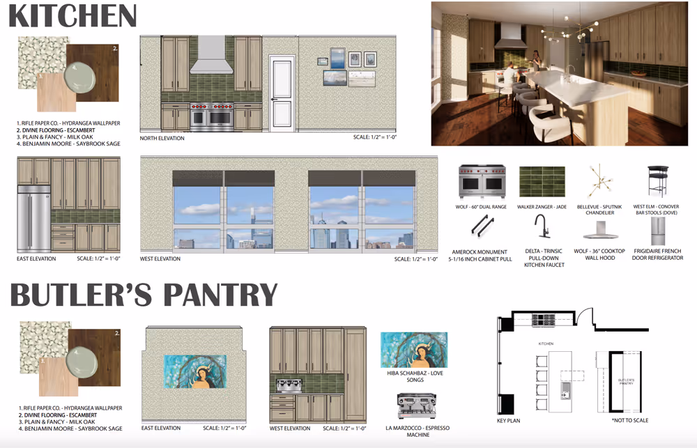 For this project, I designed a three-bedroom, three-bath residence at 1706 Rittenhouse in Center City, Philadelphia, for Milo and Audrey, a couple whose personalities and careers complement one another. Audrey, founder of Rifle Paper Co., inspired an artistic and refined aesthetic, reflected through bold patterns, curated artwork, and carefully detailed finishes. Milo's musical background and love for the kazoo added a playful, personal touch, introducing rhythm and movement into the design through color, texture, and form. The overall plan emphasized flexibility for entertaining, with a dining room and living spaces designed for both intimate dinners and larger gatherings, while also including a private study for Audrey’s work and a media space for Milo’s collection of instruments, awards, and film interests.
